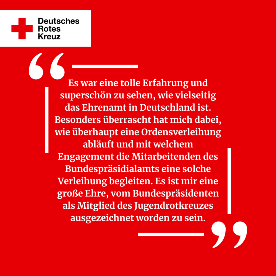 David Schöck sagte im Anschluss an die Veranstaltung: „Es war eine tolle Erfahrung und superschön zu sehen, wie vielseitig das Ehrenamt in Deutschland ist. Besonders überrascht hat mich dabei, wie überhaupt eine Ordensverleihung abläuft und mit welchem Engagement die Mitarbeitenden des Bundespräsidialamts eine solche Verleihung begleiten. Es ist mir eine große Ehre, vom Bundespräsidenten als Mitglied des Jugendrotkreuzes ausgezeichnet worden zu sein.“