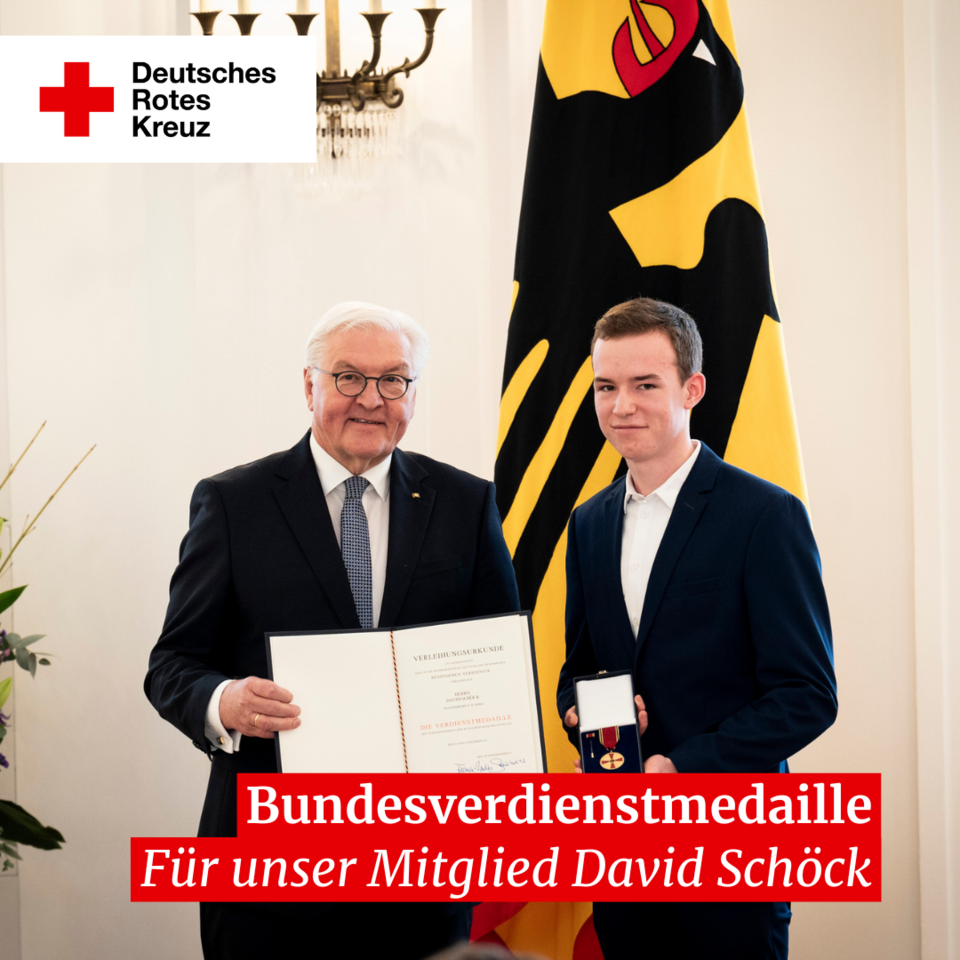 Am vergangenen Montag, den 04.12.2023, wurde ein Mitglied des DRK Ortsverein Bad Homburg mit einer der höchsten deutschen Orden ausgezeichnet – der Bundesverdienstmedaille. Der Ausgezeichnete, David Schöck, ist gerade einmal 17 Jahre alt und ehrenamtliches Mitglied des Deutschen Roten Kreuzes in Bad Homburg. Um es in den Worten von Herrn Bundespräsidenten Frank-Walter Steinmeier und Tagesschaumoderatorin Susanne Daubner zu fassen: